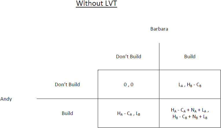 Each player decides whether to build a house or not. With a land value tax, LA=LB=0. Here are the games with and without a land value tax: